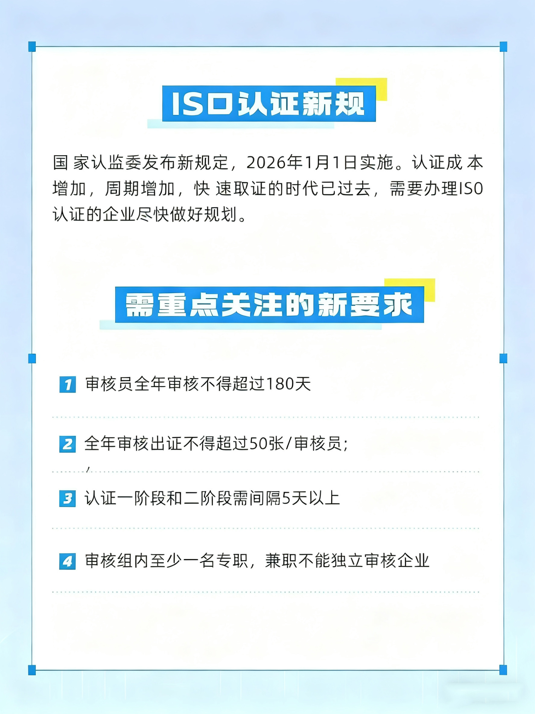 离新规不足两个月了,把握机会,企业需要办理ISO认证的,不要再等了!以后,更贵!很严!流程更复杂!办理咨询15034409001(同V)
