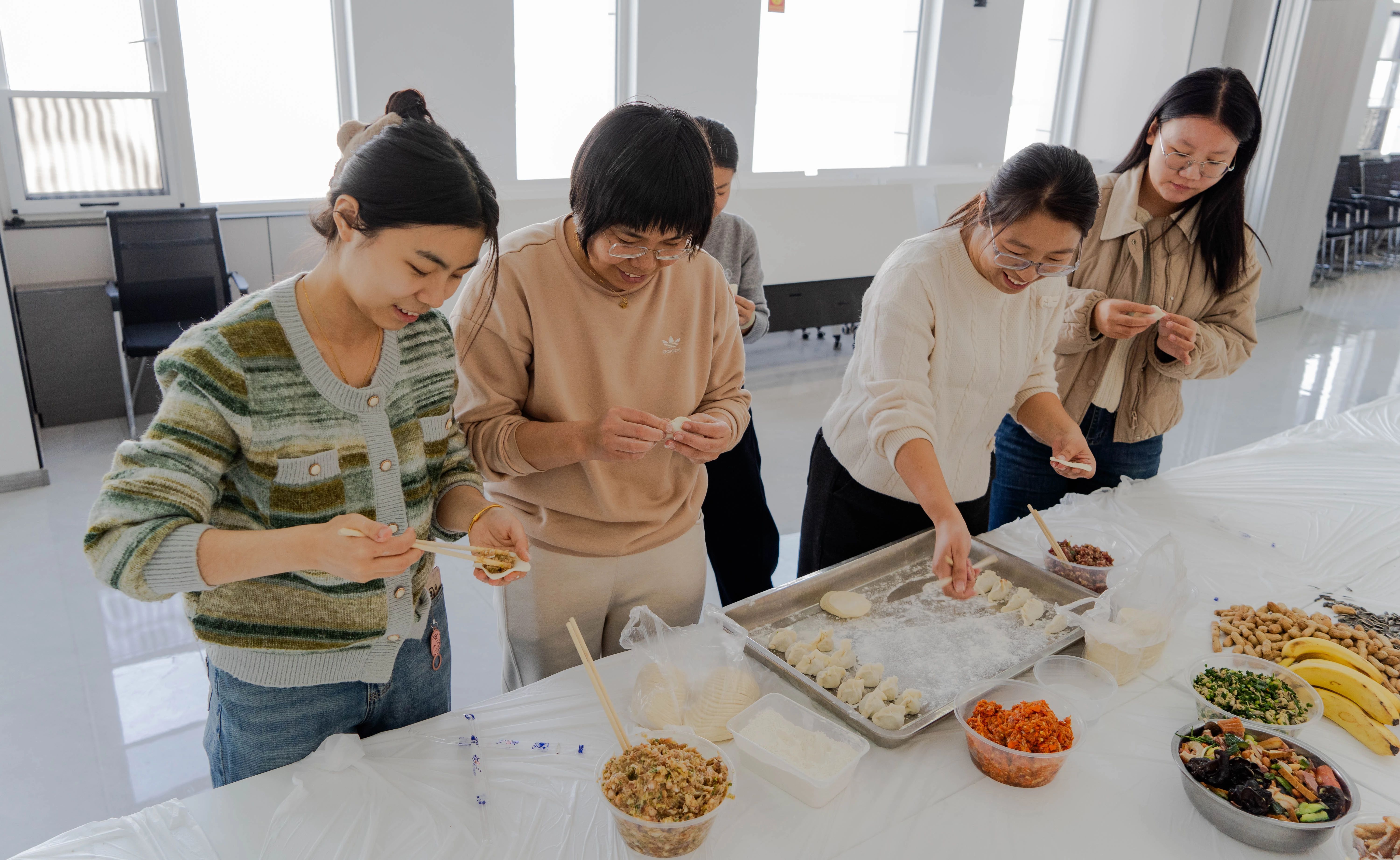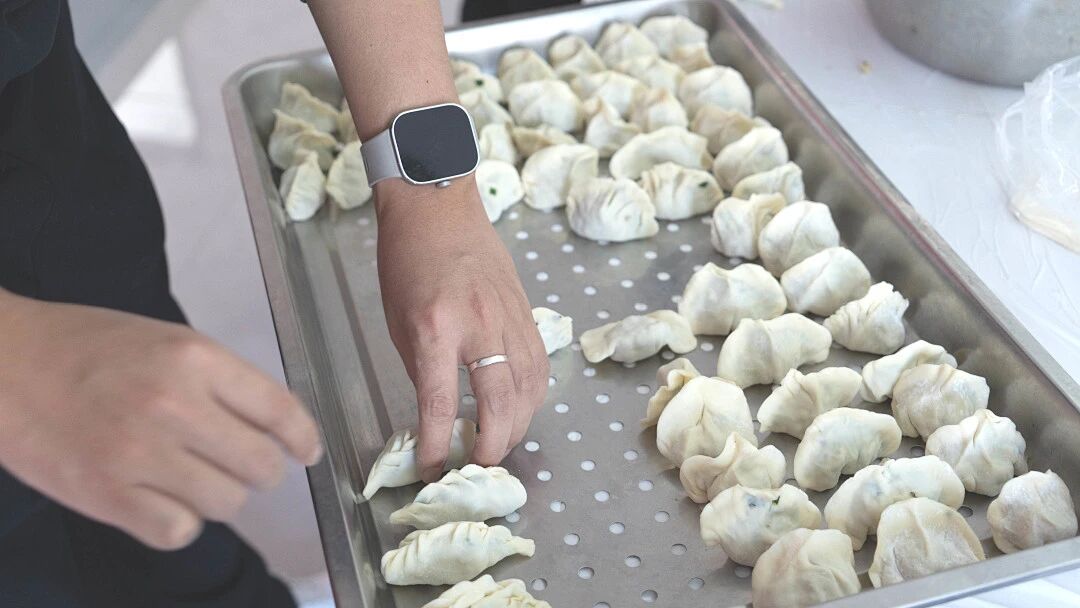 活动当天,公司早早准备好了面团和馅料。大家发挥各自所长,调馅儿、揉面、掐剂子、擀皮……配合默契,掐剂子的快如飞矢、擀皮的行云流水、包捏的精益求精,一套“科学”的包饺子流水线游刃有余。有的人炫起自己的包饺子手艺,同时擀三四张饺子皮;有的人还主动承担起“教学任务”,手把手教年轻同事,“饺子放在虎口位置,大拇指和食指这样一捏,一个圆鼓鼓胖乎乎的饺子就包好啦”。几个“小白”围在身边,认真又笨拙地模仿着,不一会儿就包出了像模像样的饺子,成就感满满。饺子摆出的“幸福大唐”四个字,引得大家纷纷拍照打卡,在欢声笑语中,一盘盘包进了美味与情谊的饺子陆续下锅。