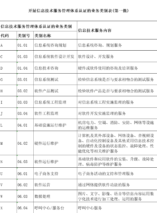 根据国家认监委2012年第8号公告《关于开展信息技术服务管理体系认证工作的公告》,目前国内开展ISO20000管理体系认证的范围一共分为以下几个类别: