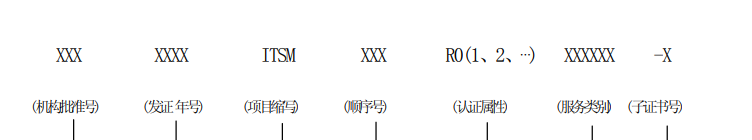 XXXXXX-服务类别:信息技术服认证的服务类别代码,如:A-信息系统咨询规划服务。(代码划分规则见国家认监委确定的《开展信息技术服务管理体系认证的业务类别表》