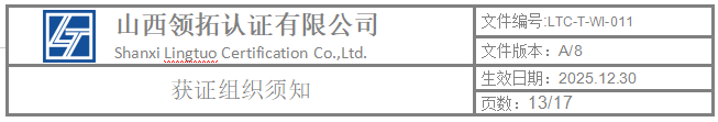 通报是山西领拓认证有限公司与获证组织间进行沟通的一种手段,该要求获证组织指定一个常设机构负责管理体系的维护并保持与我司的经常性联络(获证组织应有与我司联络的程序,以确保向我司提供最新的信息),及时反映有关信息。当获证组织发生如下情况时,应在一周内及时以书面形式向我司通报: