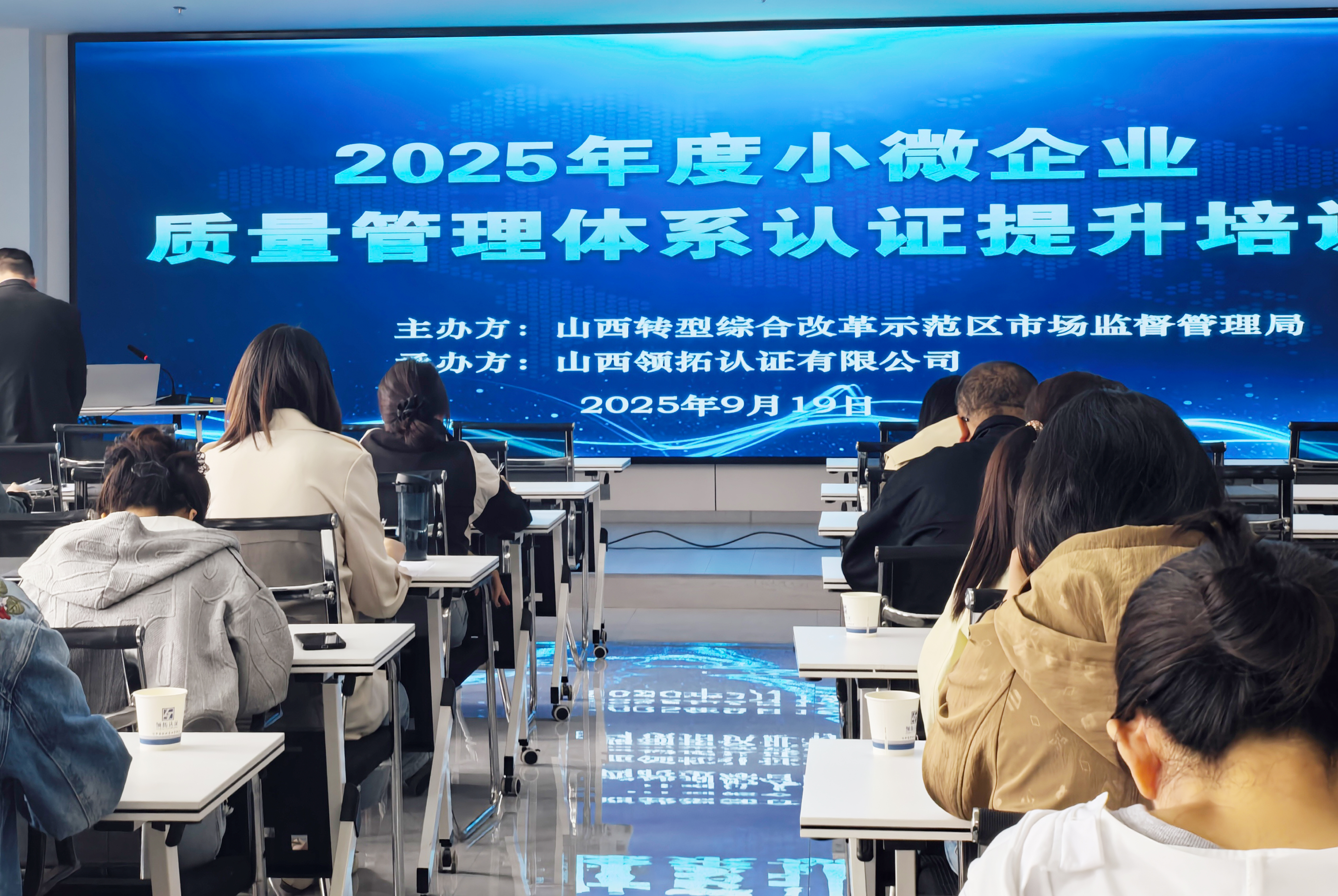 2025 年 9 月 19 日,山西领拓认证有限公司联合山西转型综合改革示范区市场监督管理局在太原综改区联东 U 谷 A 幢 13 号楼 4 层会议室,共同举办山西省中小微企业质量管理体系认证提升现场培训,为当地小微企业高质量发展注入新动力。