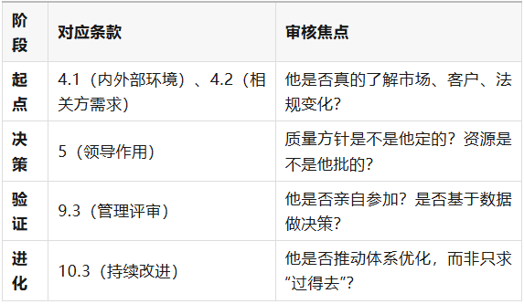 很多审核员还在背诵“5.1.1 a)到j)”,但真正高效的审核,是从体系逻辑出发: