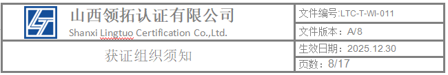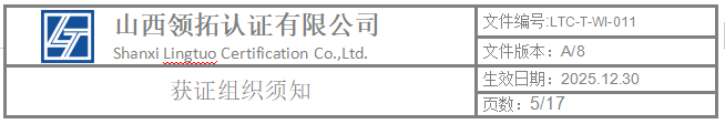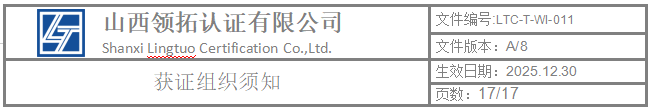 通报是山西领拓认证有限公司与获证组织间进行沟通的一种手段,该要求获证组织指定一个常设机构负责管理体系的维护并保持与我司的经常性联络(获证组织应有与我司联络的程序,以确保向我司提供最新的信息),及时反映有关信息。当获证组织发生如下情况时,应在一周内及时以书面形式向我司通报: